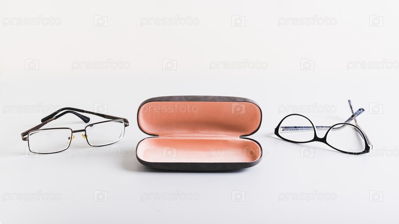 Открытый жесткий футляр для хранения и очки рядом на веб-баннере стола