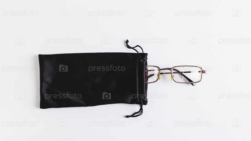 Концепция неправильного хранения старых разбитых очков в мягком футляре на столе, вид сверху