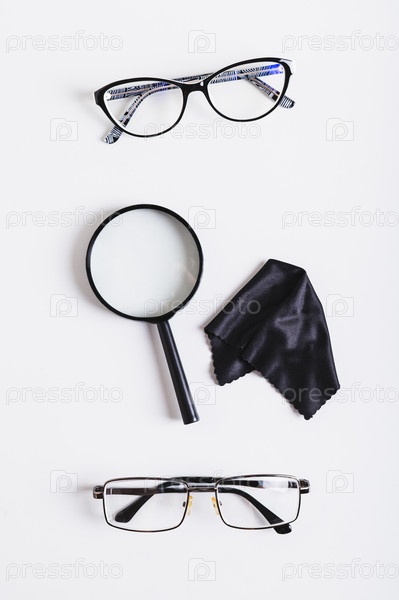 Концепция выбора, очки, увеличительное стекло и чистящая ткань сверху и вертикальный вид
