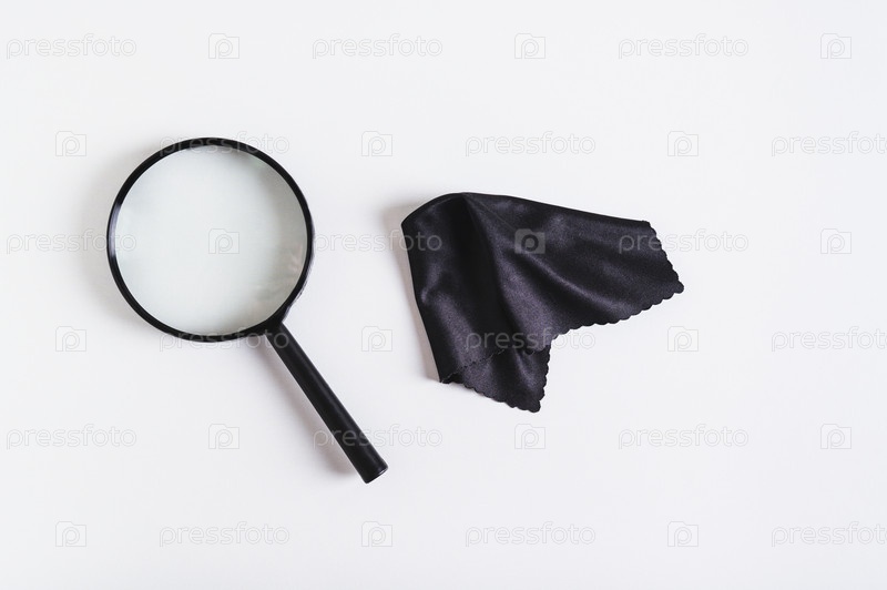 Лупа для увеличения в черной пластиковой рамке и чистящая ткань на синем фоне, вид сверху