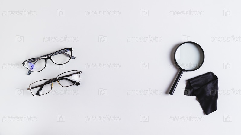Пара очков, лупа и чистящая ткань на синем фоне, вид сверху веб-баннера