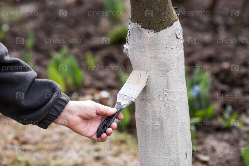 Побелка плодовых деревьев в весеннем саду. Ствол дерева, рука садовника с кистью и белилами, красящая яблоню белилами