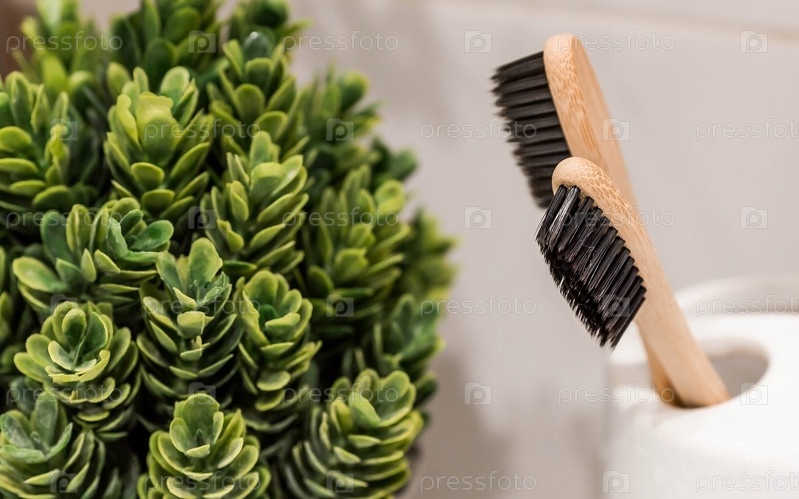 Современный интерьер ванной комнаты. Панорамный вид на экологически чистые деревянные щетки для полости рта и зеленые растения. Декор, детали ванной комнаты