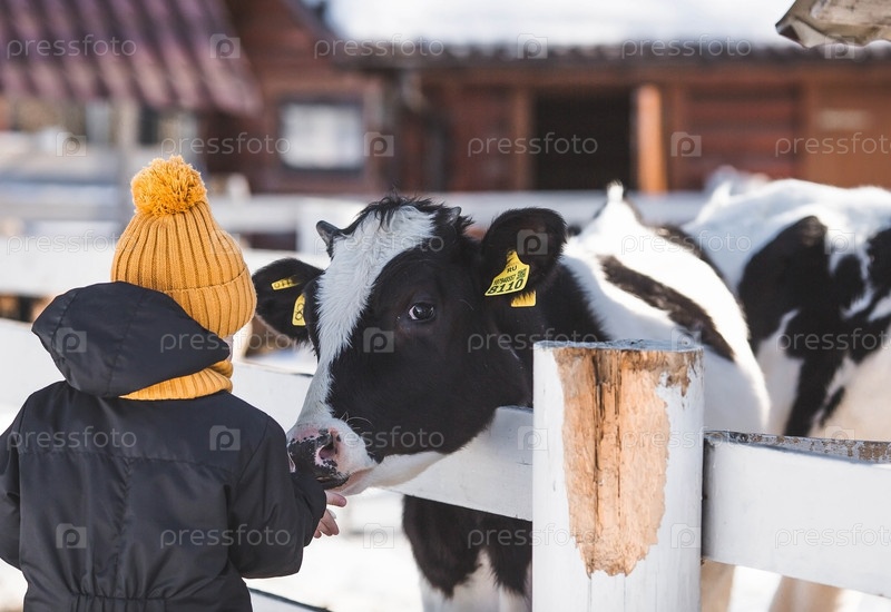 Маленький мальчик кормит корову на ранчо, на частной эко-ферме или в контактном зоопарке. Ребенок ласкает животных в зоопарке. Выходные с семьей