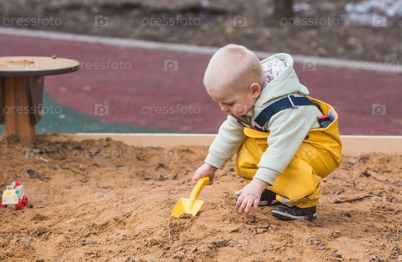 Красивый, веселый маленький мальчик двух лет гуляет весной на детской площадке. Ребенок играет лопаткой в песочнице. Концепция родительства, счастливого детства и семьи