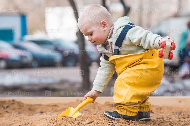 Красивый, веселый маленький мальчик двух лет гуляет весной на детской площадке. Ребенок играет лопаткой в песочнице. Концепция родительства, счастливого детства и семьи