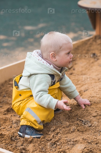 Красивый, веселый маленький мальчик двух лет гуляет весной на детской площадке. Ребенок играет лопаткой в песочнице. Концепция родительства, счастливого детства и семьи
