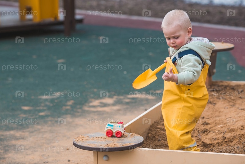 Красивый, веселый маленький мальчик двух лет гуляет весной на детской площадке. Ребенок играет лопаткой в песочнице. Концепция родительства, счастливого детства и семьи