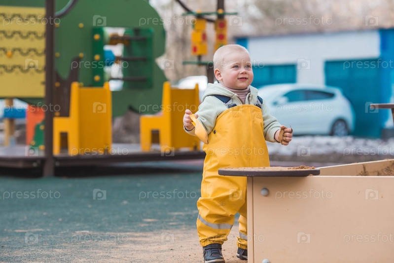 Красивый, веселый маленький мальчик двух лет гуляет весной на детской площадке. Ребенок играет лопаткой в песочнице. Концепция родительства, счастливого детства и семьи