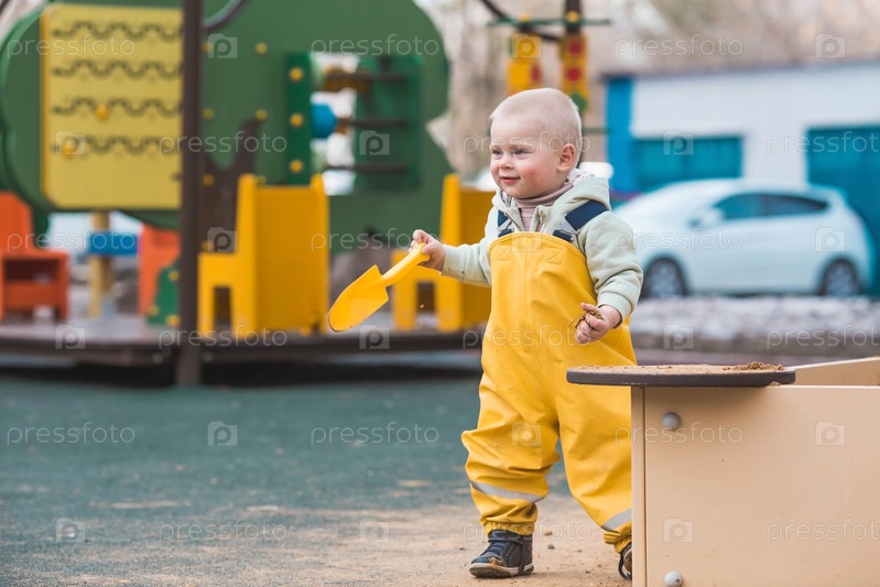 Красивый, веселый маленький мальчик двух лет гуляет весной на детской площадке. Ребенок играет лопаткой в песочнице. Концепция родительства, счастливого детства и семьи