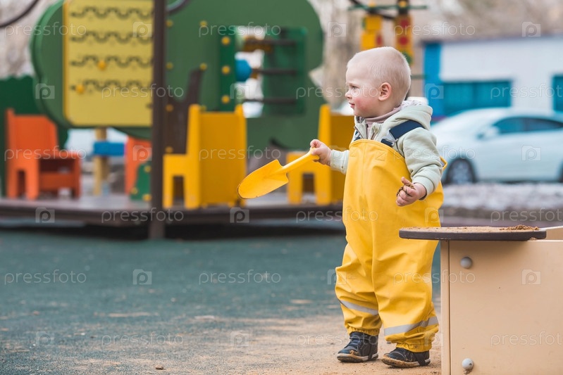 Красивый, веселый маленький мальчик двух лет гуляет весной на детской площадке. Ребенок играет лопаткой в песочнице. Концепция родительства, счастливого детства и семьи