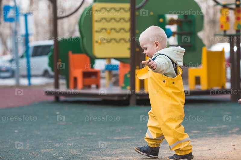 Красивый, веселый маленький мальчик двух лет гуляет весной на детской площадке. Ребенок играет лопаткой в песочнице. Концепция родительства, счастливого детства и семьи