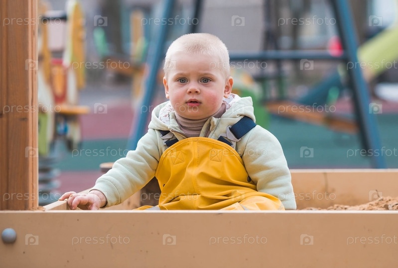Красивый, веселый маленький мальчик двух лет гуляет весной на детской площадке. Ребенок играет лопаткой в песочнице. Концепция родительства, счастливого детства и семьи