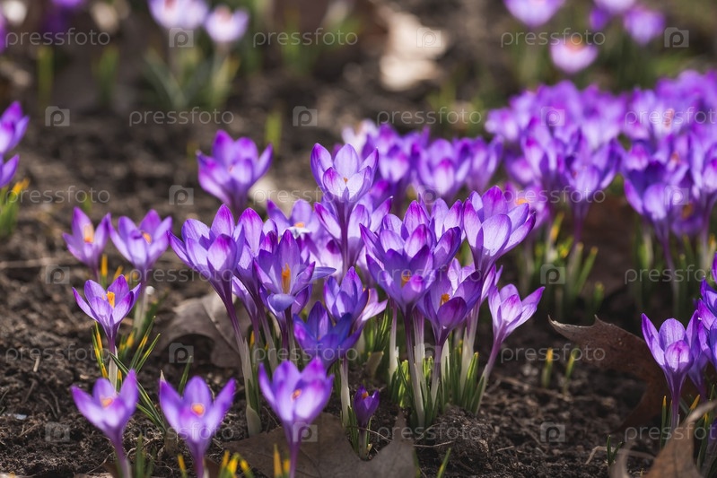 Первые цветки весны - фиолетовые крокусы (лат. crocus) в крупном плане утром под солнечным светом