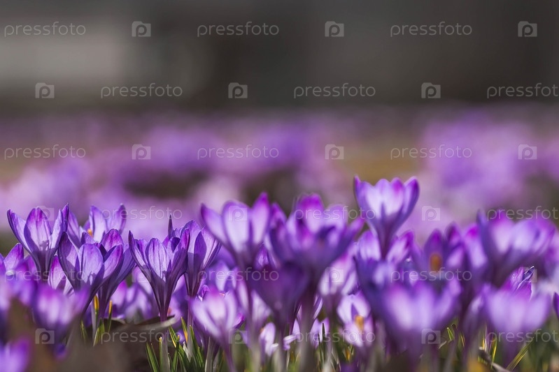 Первые цветки весны - фиолетовые крокусы (лат. crocus) в крупном плане утром под солнечным светом