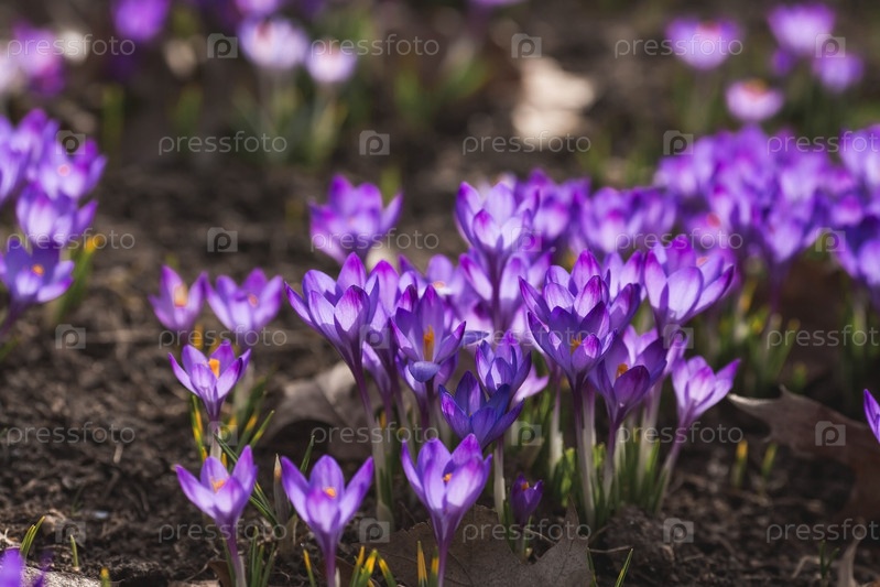 Первые цветки весны - фиолетовые крокусы (лат. crocus) в крупном плане утром под солнечным светом