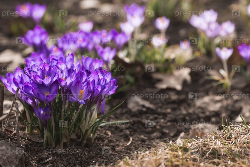 Первые цветки весны - фиолетовые крокусы (лат. crocus) в крупном плане утром под солнечным светом