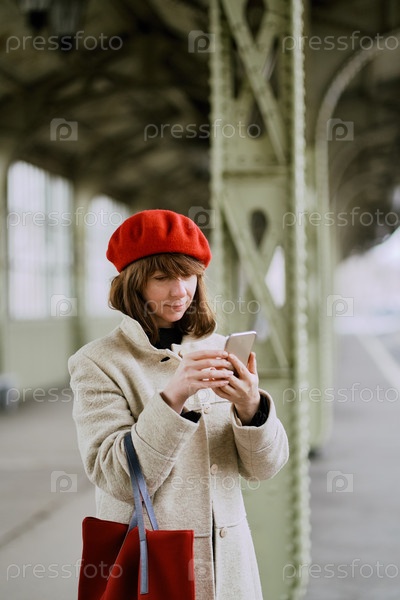 Железнодорожная станция. Красивая девушка ждет поезда и смотрит на мобильный телефон. Женщина путешествует налегке