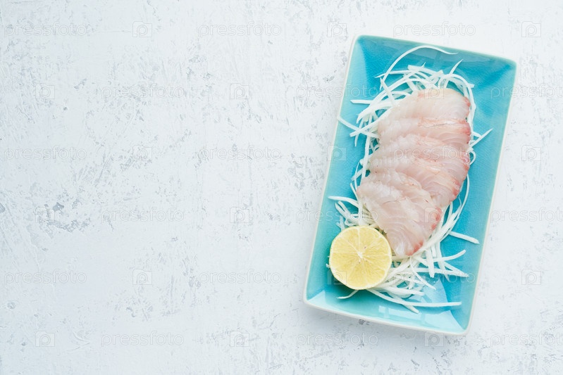 Сашими из кусочков сырого филе белой рыбы на синей тарелке на белом фоне. Целый кусок свежей рыбы с зеленью и лимоном на редисе. Копировать пространство
