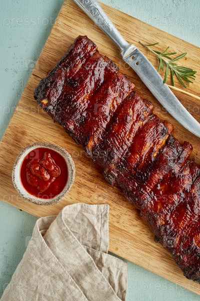 Свиные ребрышки барбекю. Рецепт медленного приготовления. Целое маринованное жареное мясо свинины с красным соусом на разделочной доске, вертикально, вид сверху. Бирюзовый фон