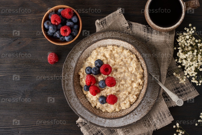 Овсяная деревенская каша с черникой, малиной в керамической винтажной миске, диета с ягодами, деревянный темно-коричневый фон, вид сверху крупным планом. Здоровый диетический завтрак