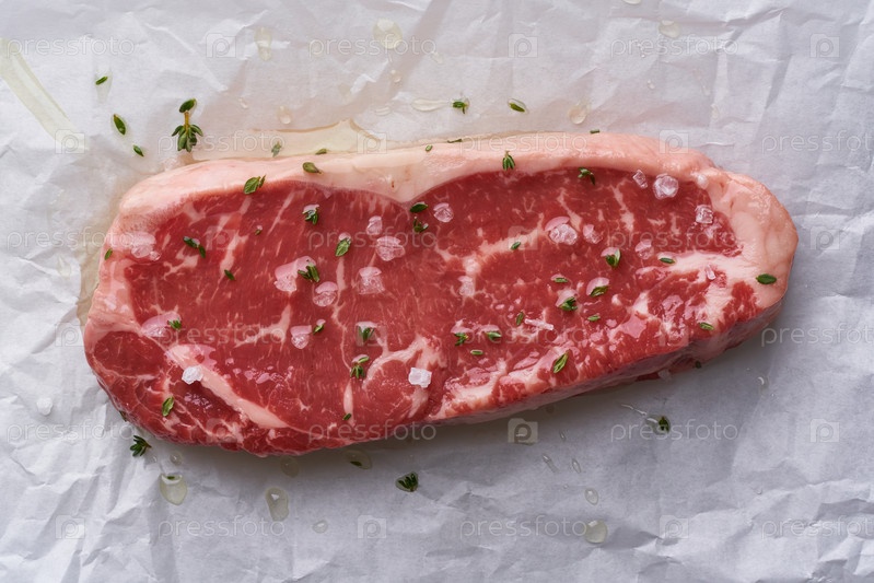 Сырой стейк с приправами и солью. Вид сверху, крупный план