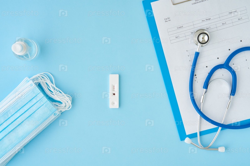 Положительный тест на антитела к вирусу ковид-19. Ярко-синий стол, медицинская маска, экспресс-тест на коронавирус