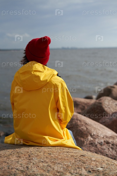 Вид сзади на женщину, сидящую в ярко-желтом плаще и красной шляпе на камне у берега Северного моря