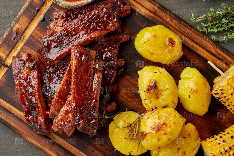 Острые свиные ребрышки барбекю, кукурузные початки и картофельное пюре. Рецепт медленного приготовления. Маринованная жареная свинина с красным соусом. Американская кухня. Вид сверху