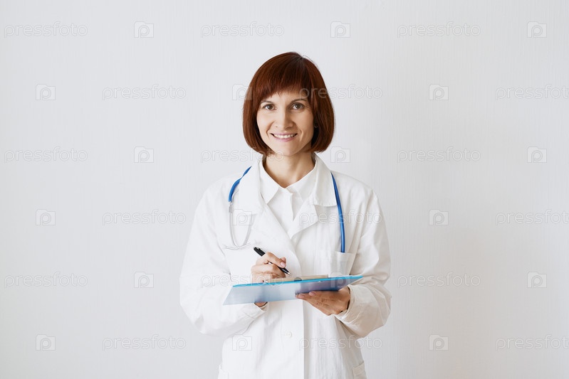 Взрослая женщина-врач стоит на белом фоне. Красивая женщина, думает, улыбается, пишет. Блокнот в руке, стетоскоп на шее