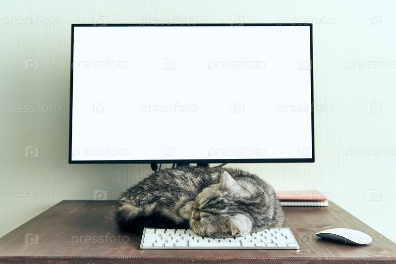 Сохраняйте спокойствие и оставайтесь дома. Пушистый кот спит на рабочем столе рядом с компьютером