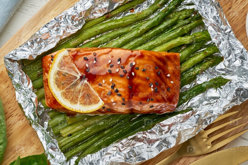 Ужин в фольге с красной рыбой. Филе лосося со спаржей. Горячий ужин, запеченный в духовке, кето-палео-диета