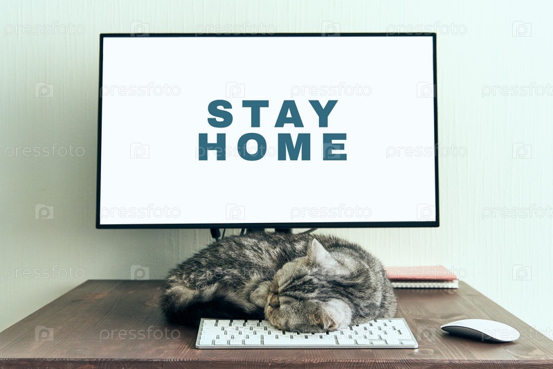 Сохраняйте спокойствие и оставайтесь дома. Пушистый кот спит на рабочем столе рядом с компьютером. Спокойствие, невозмутимость, комфортный милый уютный дом