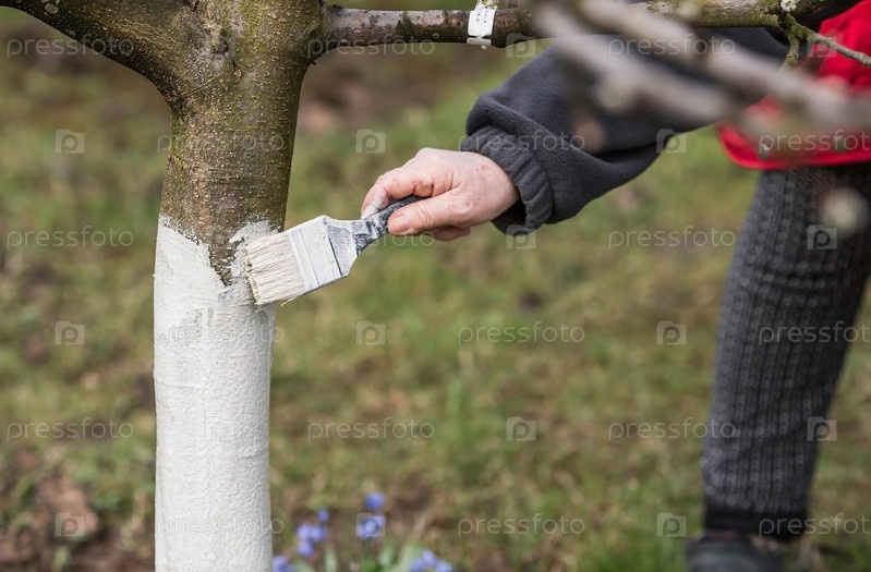 Побелка плодовых деревьев в весеннем саду. Ствол дерева, рука садовника с кистью и белилами, красящая яблоню белилами