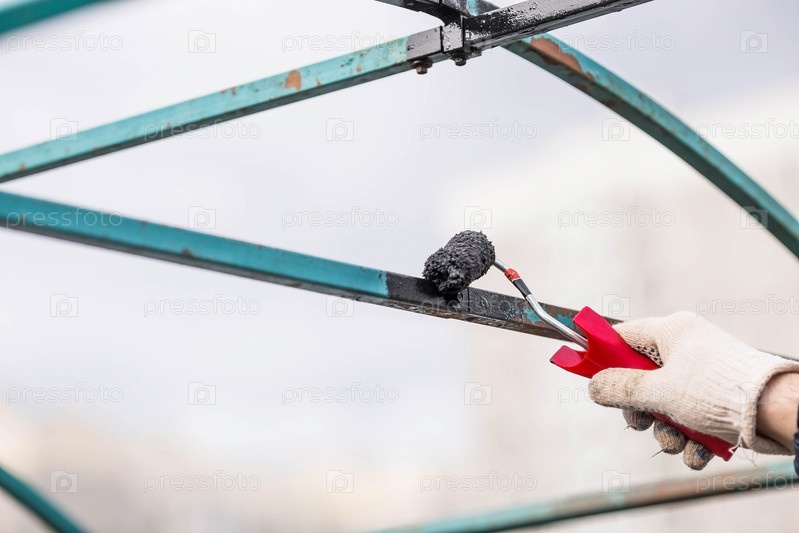 Мужчина работает кистью и черной краской по ржавчине. Рука красит металлические конструкции крупным планом. Удаление ржавчины. Половина — окрашенная поверхность. Размазывание малярной кистью