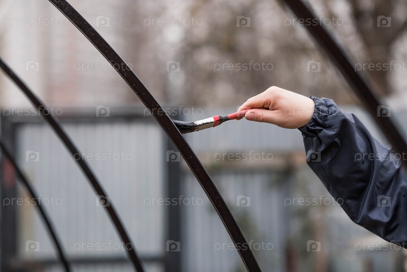 Мужчина работает кистью и черной краской по ржавчине. Рука красит металлические конструкции крупным планом. Удаление ржавчины. Половина — окрашенная поверхность. Размазывание малярной кистью