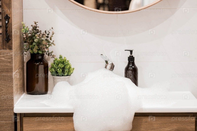 Современный интерьер ванной комнаты с умывальником и краном. Панорамный вид на дозатор мыла в бутылке и зеленые растения возле металлического крана. Декор, детали ванной комнаты