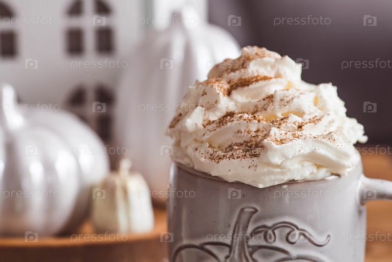 Сезонный напиток. Вкусный тыквенный латте со взбитыми сливками и корицей в кружке на деревянном столе в интерьере гостиной. Осенний декор в доме. Скандинавский стиль