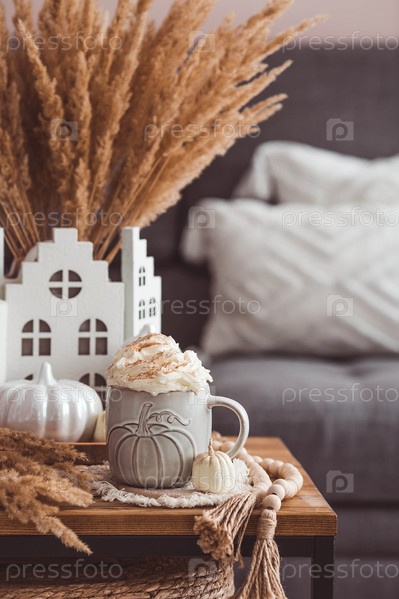 Сезонный напиток. Вкусный тыквенный латте со взбитыми сливками и корицей в кружке на деревянном столе в интерьере гостиной. Осенний декор в доме. Скандинавский стиль
