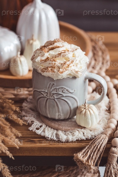 Сезонный напиток. Вкусный тыквенный латте со взбитыми сливками и корицей в кружке на деревянном столе в интерьере гостиной. Осенний декор в доме. Скандинавский стиль