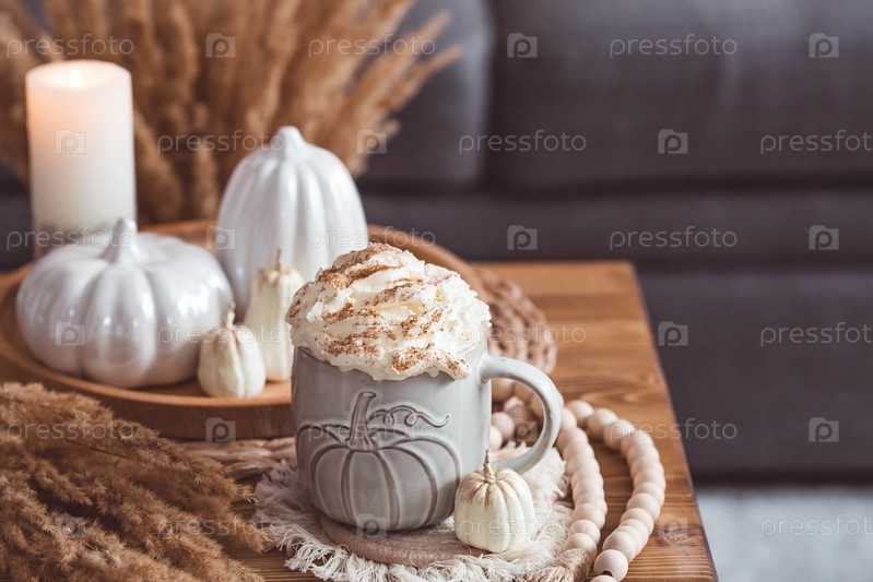 Сезонный напиток. Вкусный тыквенный латте со взбитыми сливками и корицей в кружке на деревянном столе в интерьере гостиной. Осенний декор в доме. Скандинавский стиль