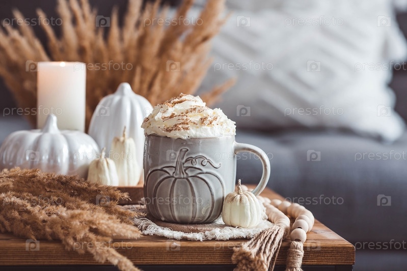 Сезонный напиток. Вкусный тыквенный латте со взбитыми сливками и корицей в кружке на деревянном столе в интерьере гостиной. Осенний декор в доме. Скандинавский стиль