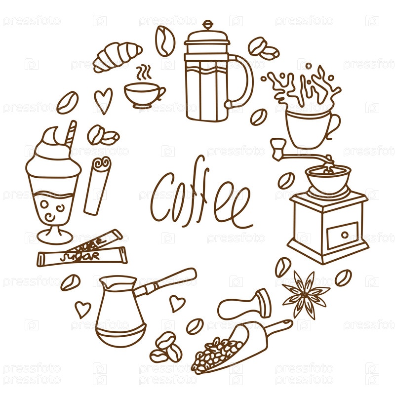 Баннер для кофейни. Симпатичные каракули мультяшные иконки кафе. Набор рисованных вручную дизайнов кофе: напитки, закуски и кофейная посуда. Векторный контур рисованной кофе и пекарни для меню кафе. Вектор
