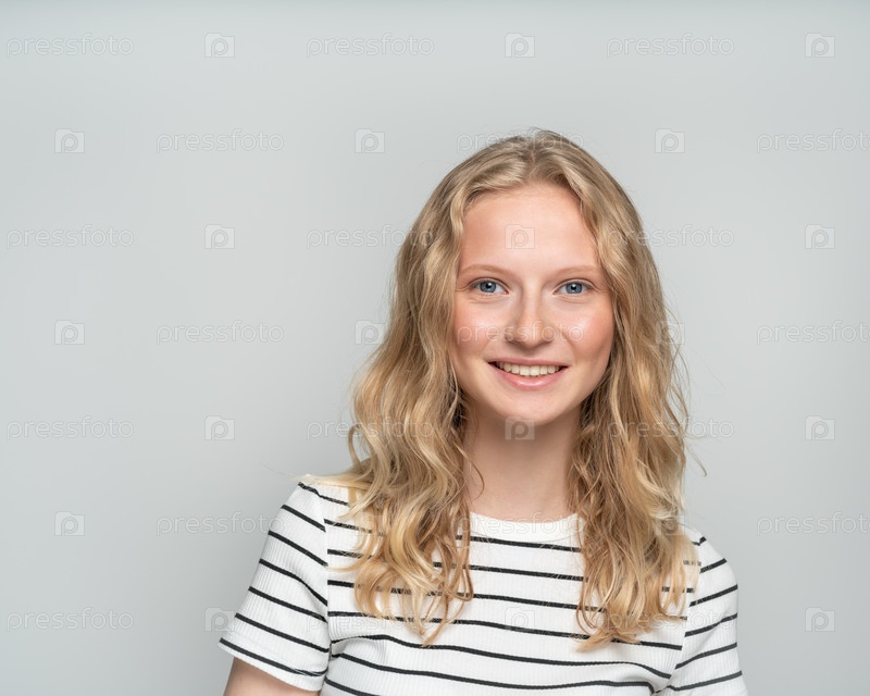 Красивая молодая улыбающаяся блондинка без макияжа на белой стене