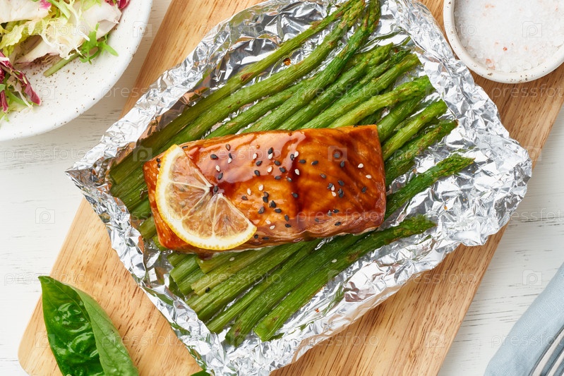 Ужин в фольге с рыбой. Филе лосося со спаржей. Здоровое диетическое питание, кето-диета, средиземноморская кухня. Горячий ужин, запеченный в духовке