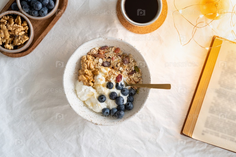 Книга вида сверху и рождественский завтрак здорового образа жизни с мюсли мюсли и йогуртом в миске на белом фоне стола, зерновые продукты с семенами орехов. Органическое утреннее диетическое блюдо с овсом