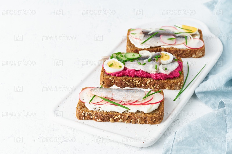 Пикантный смореброд, набор традиционных датских сэндвичей. Черный ржаной хлеб с анчоусами, свеклой, редисом, яйцами, сливочным сыром на серой тарелке на белом каменном столе, вид сбоку, пространство для копирования