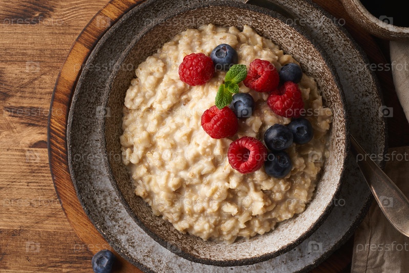 Овсяная деревенская каша с черникой, малиной в керамической винтажной миске, диета с ягодами, деревянный темно-коричневый фон, вид сверху крупным планом. Здоровый диетический завтрак