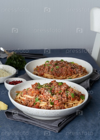 Паста Болоньезе Лингвини с фаршем и помидорами. Итальянский ужин на двоих за столом, синяя скатерть, стул, домашний уют. Вид сбоку
