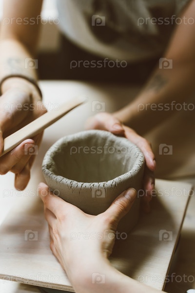 Женщина делает керамическую керамику, крупным планом в четыре руки, фокусируется на гончарах, ладонях с керамикой, концепция мастер-класса и мастер-класса, избирательный фокус